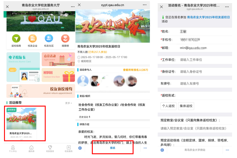 第三步:在“校友服务大厅”中点击“2025年校友返校日活动”,进行线上报名,校友车辆务必提前在报名系统中录入车牌信息。