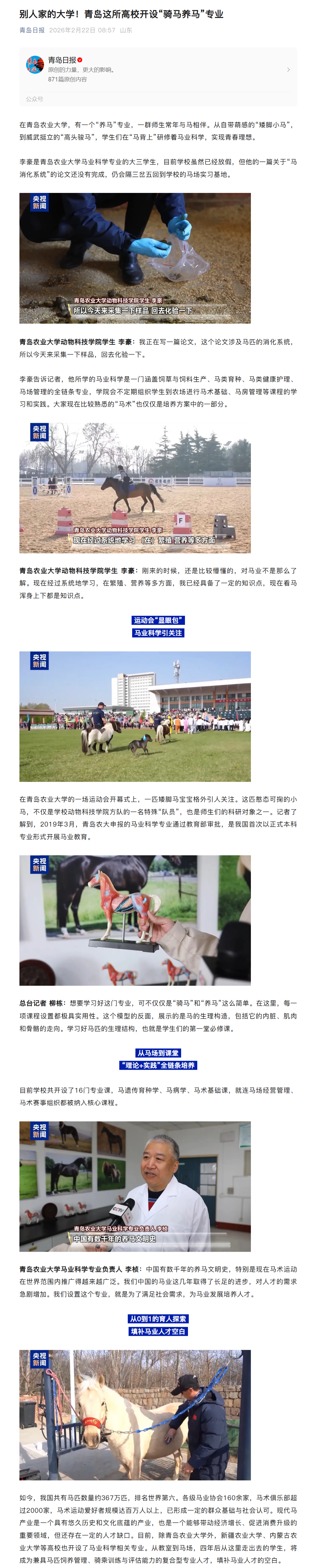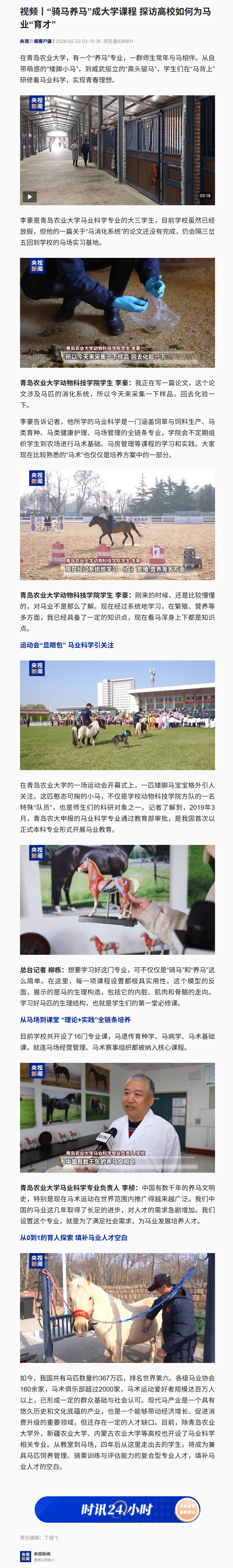 2月22日 央视新闻:视频丨“骑马养马”成大学课程 探访高校如何为马业“育才”