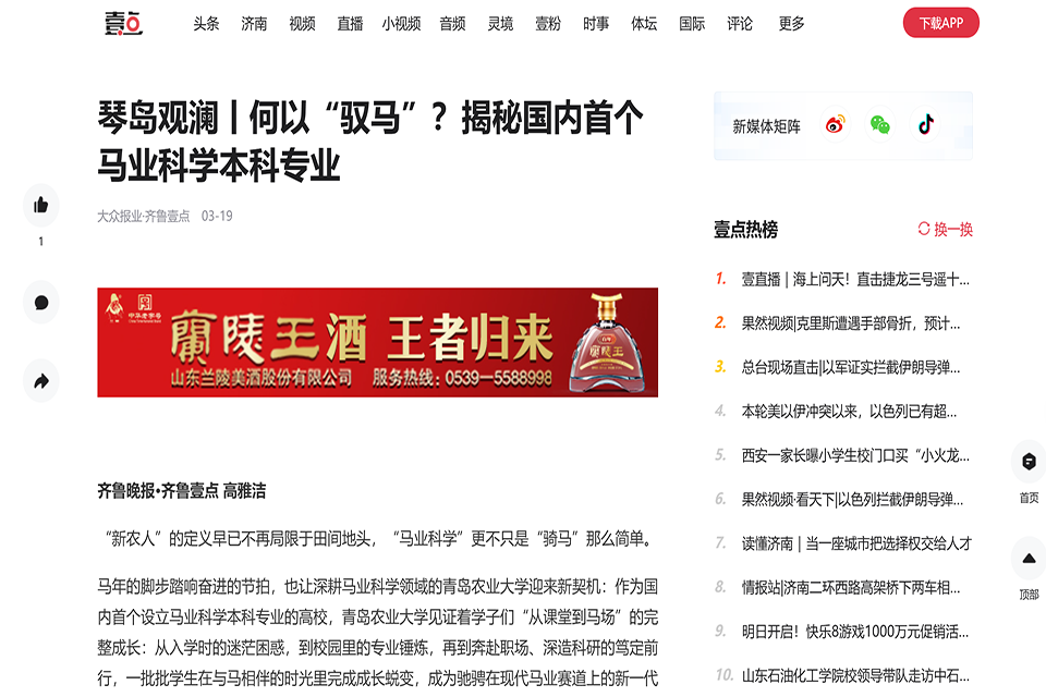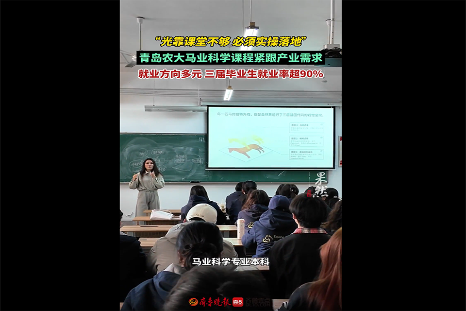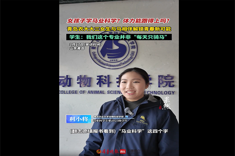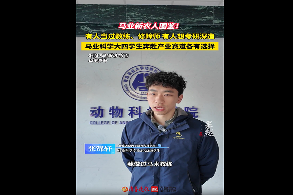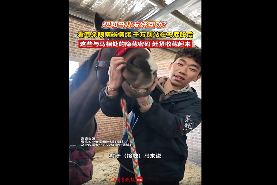 【编者按】3月19日,大众报业·齐鲁壹点、齐鲁晚报青岛融媒报道了太阳成集团tyc41183马业科学学院学生在与马相伴的时光里完成成长蜕变,成为驰骋在现代马业赛道上的新一代“新农人”。