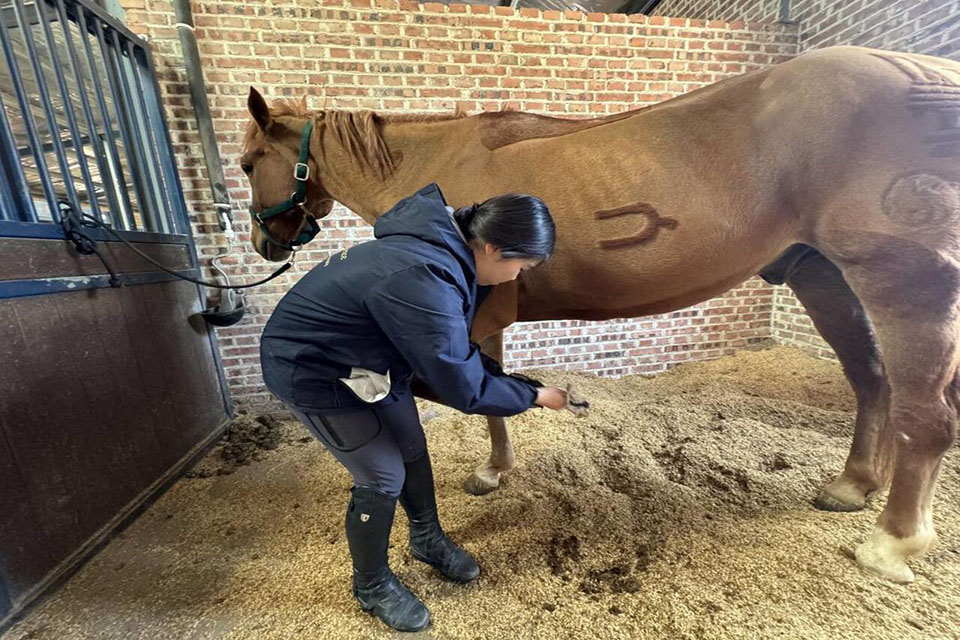 张锦轩还曾跟着法国修蹄师实习。“修蹄前要先评估马的步态,卸掉旧蹄铁后,还要根据马蹄形状打铁塑形,整个过程虽累但很严谨。”张锦轩表示,健康马匹每个月需修蹄一次,通常40分钟才能完成整套流程。而王荣健也曾在广州华亮马术实习时,凭借课堂知识及时发现一匹教学马精神不佳、食欲下降的异常。