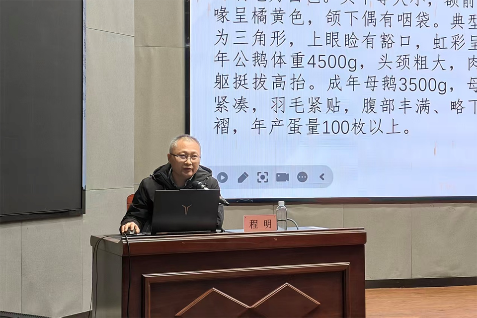 1月4日下午,动科学院在平度校区博学楼多功能厅举办“从畜牧业发展历史与现状谈未来发展趋势”专题讲座。学院特邀请青岛市畜牧工作站种质资源科负责人、正高级畜牧师程明担任主讲嘉宾,2025级动物科学专业全体学生参加报告会。报告会由动物科学专业负责人郭艺璇主持。