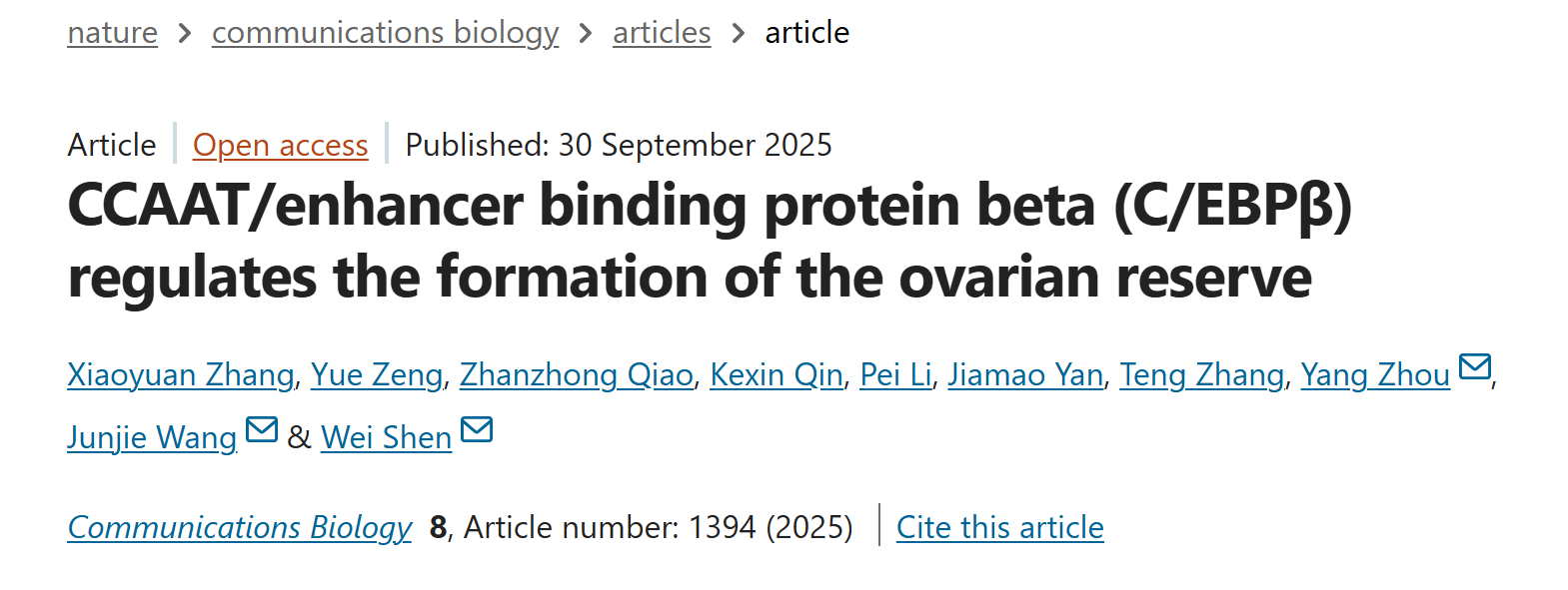 近日,tyc41183太阳成集团沈伟课题组在哺乳动物卵巢储备建立机制解析方面取得重要进展,相关成果以“CCAAT/enhancer binding protein beta (C/EBPβ) regulates the formation of the ovarian reserve”为题,在线发表于《Communications Biology》(生物学一区Top期刊)