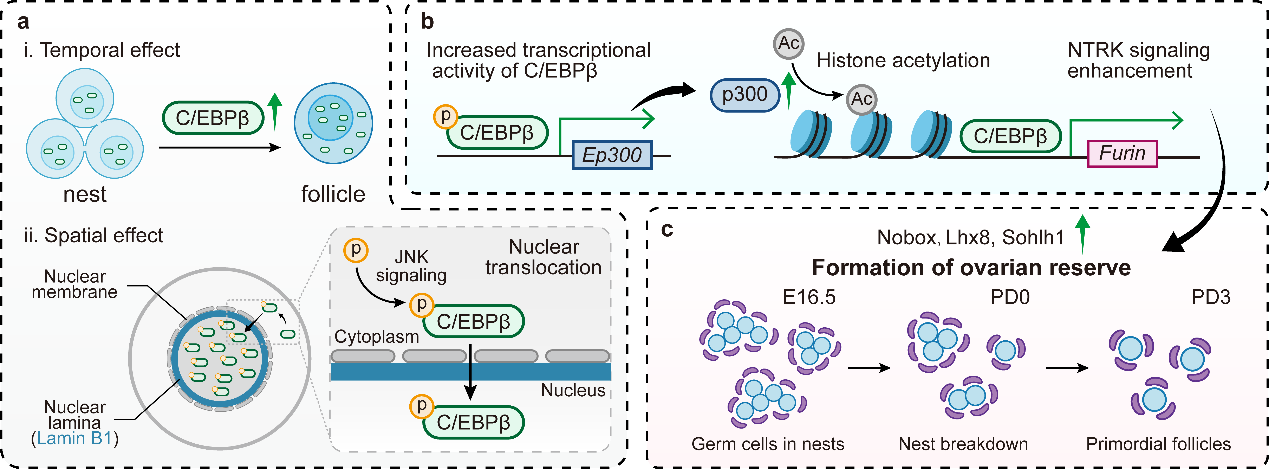 课题组通过建立体内体外模型、表观组学分析、“蛋白-蛋白”及“蛋白-核酸”互作分析等方法,发现C/EBPβ是卵巢储备建立的关键调节因子。研究发现C/EBPβ在小鼠原始卵泡形成过程中表达增强,并在原始卵泡组装阶段的生殖细胞中发生核易位。体外敲低C/EBPβ可抑制卵巢储备建立相关蛋白的表达,导致卵泡形成受阻。从机制上讲,染色质可及性分析表明,C/EBPβ结合组蛋白乙酰化酶编码基因Ep300的启动子区促进其表达,并通过维持Furin蛋白酶启动子区的染色质可及性来增强卵巢储备建立所必需的神经营养因子受体酪氨酸激酶(NTRK)信号。此外,研究还发现C/EBPβ的核易位过程受自身磷酸化水平调控,而核纤层蛋白Lamin B1充当核易位过程的“守门员”分子。总之,这项工作进一步拓展了对哺乳动物卵巢储备建立调控机制的理解,并为卵巢早衰等相关疾病治疗靶点开发提供理论基础。