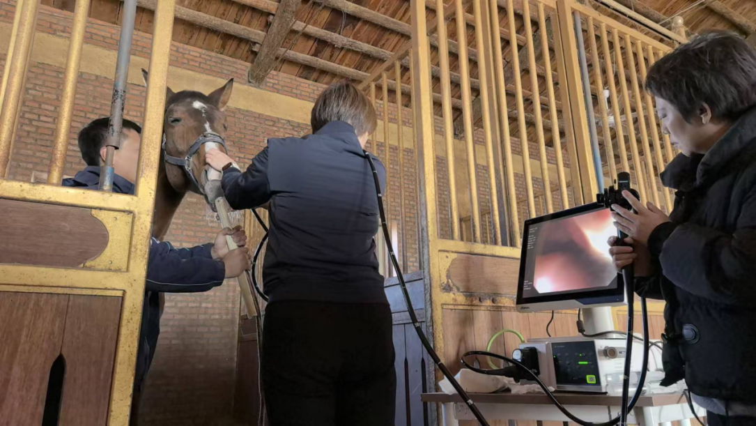 第二天,师生来到莱河大自然农场开展马胃镜检查实操教学。邹宁老师亲自演示了胃镜的使用流程,细致讲解了马胃窥镜的结构、操作要点及注意事项。学生们在指导下积极参与实践,逐步掌握了胃镜检查的基本技能。